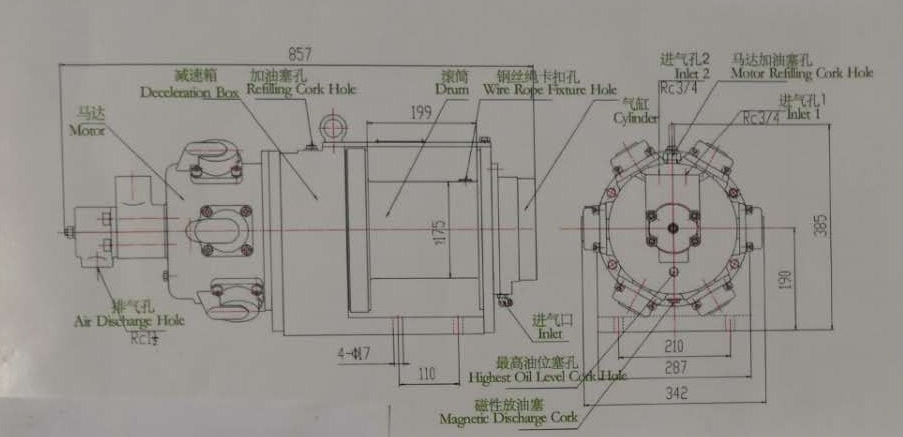 JQHSY-5-W氣動絞車,采用壓縮空氣為動力,推動TMH4A活塞式氣動馬達工作。通過二級齒輪減速,把扭矩傳給滾筒。氣動絞車的操縱,是靠手柄操縱遠程控制閥實現正轉、反轉、停止等項動作。該氣動絞車主要功能可實現遠程控制,無級調速的功能。為了保證氣動絞車的安全性,該氣動絞車還具有停車剎車功能。適合海上、陸地油田鉆井二層平臺上拖拉鉆桿及套管之用。